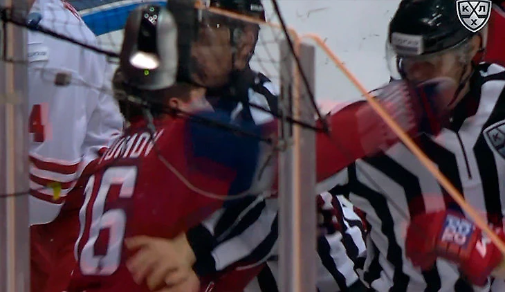 Арбитры сразу остановили матч, но удалением 5+20 Каюмов не ограничился – в стычке с финскими игроками форвард «Локомотива» нанес точный хук справа лайнсмену Ивану Дедюле.