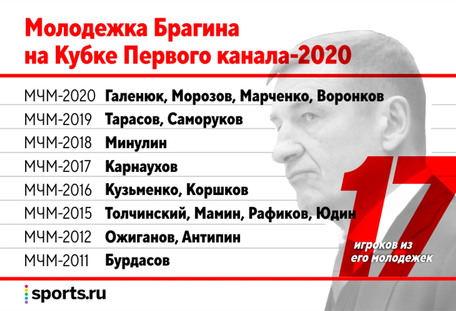 Не будем перечислять в очередной раз награды Брагина, но вот еще один интересный результат его работы: сразу 17 хоккеистов (почти полный состав) из заявки на Кубок Первого канала играли у него на разных МЧМ.