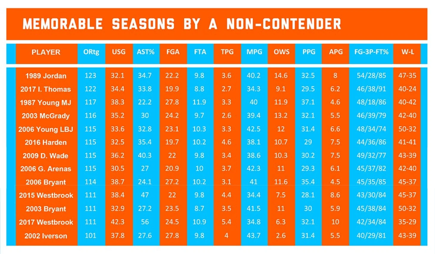 Далее я выбрал самые запоминающиеся сезоны игроков в слабых командах, которые превышали следующие параметры: процент использования – больше 30, процент передач – больше 22, рейтинг эффективности нападения – больше 111. Айверсон не попадает под эти критерии, но я его все равно включил. Если не считать Джордана в 1987-м, то все команды завершили сезон с показателем 50% побед или лучше.
