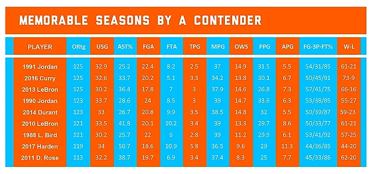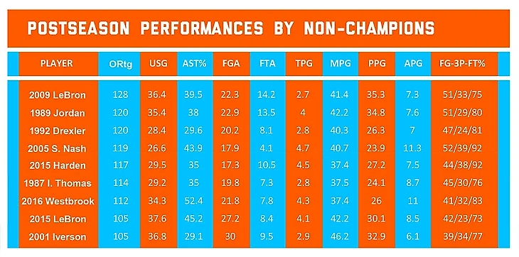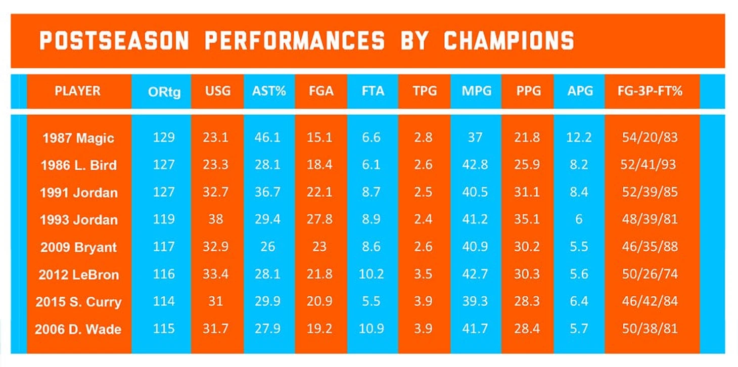 На мой взгляд, вот это восемь лучших выступлений в плей-офф за последние 40 лет в исполнении людей, которые а) выиграли титул, б) превзошли процент использования 23 и процент передач 25, в) в среднем набирали больше 21 очка и г) выдавали рейтинг эффективности атаки больше 110. В любом случае…