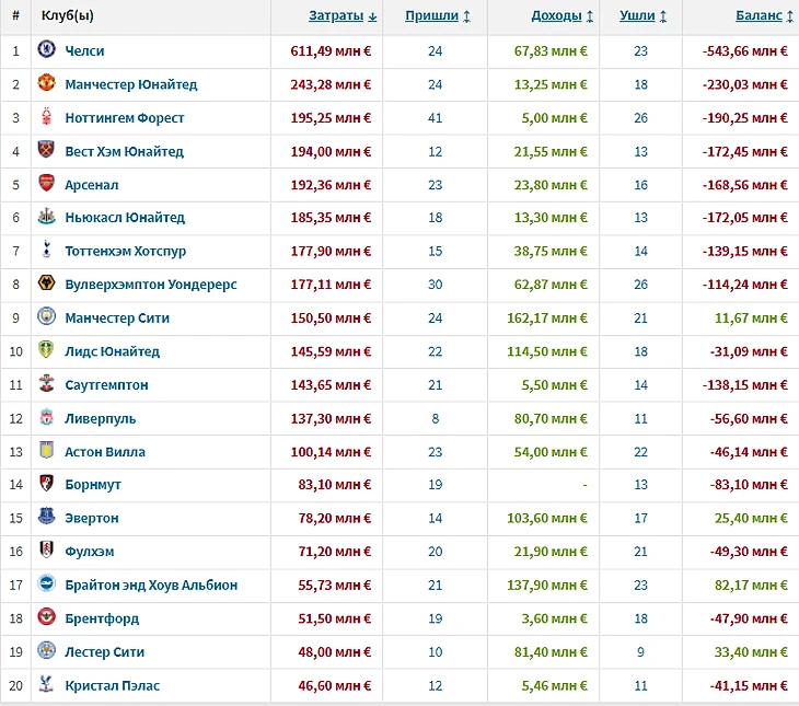 Худший показатель принадлежит «Челси»: при тратах в £546 млн фунтов команда недосчиталась 33 очков (77 → 44). Клуб больше остальных выкладывает на трансферы и необъяснимо много раскошеливается на агентов.