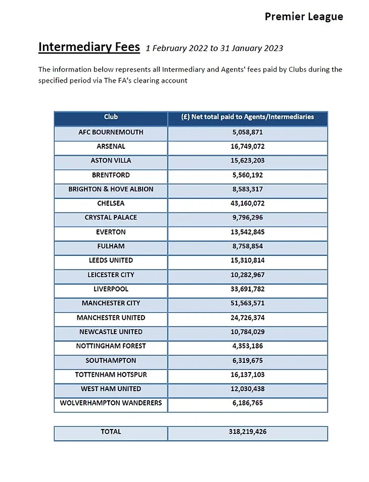 Английская Премьер-лига опубликовала таблицу агентских выплат, которые клубы сделали в период с 1 февраля 2022 года по 31 января 2023 года. Получается, что в эти подсчеты вошло летнее трансферное окно прошлого года и зимнее трансферное окно нынешнего года или просто трансферные окна сезона−2022/2023.