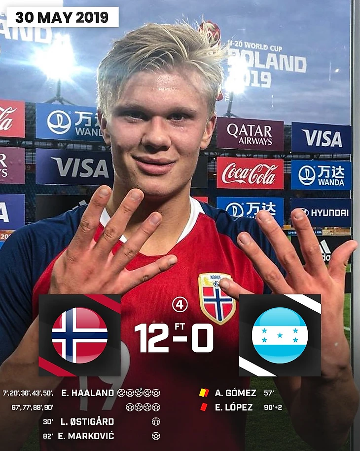 Холанд на тот момент был игроком «Зальцбурга», а 9 мячей нападающий забил в матче за молодежную сборную - дело было в Польше на молодежном чемпионате мира.