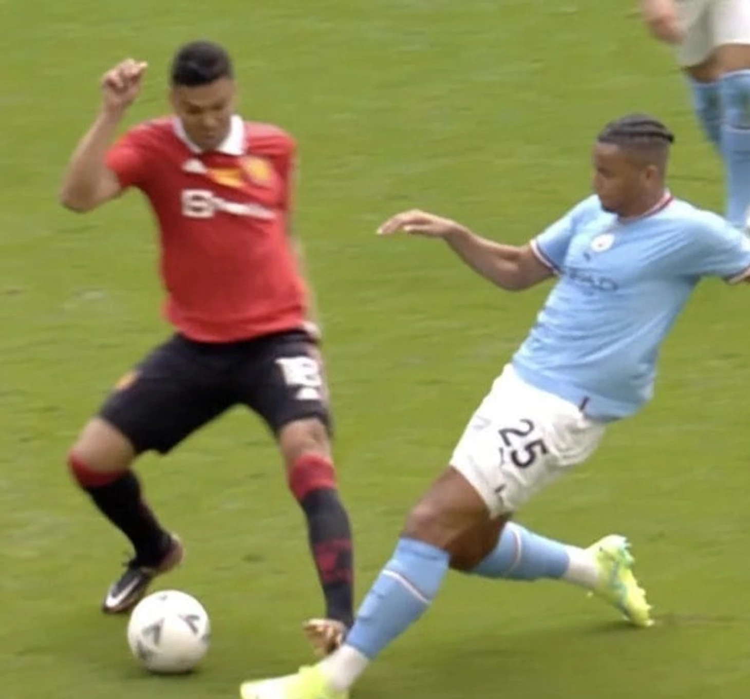 На повторе ясно видно, что полузащитник «Юнайтед» не играет в мяч и цепляет игрока «Сити» за ногу.