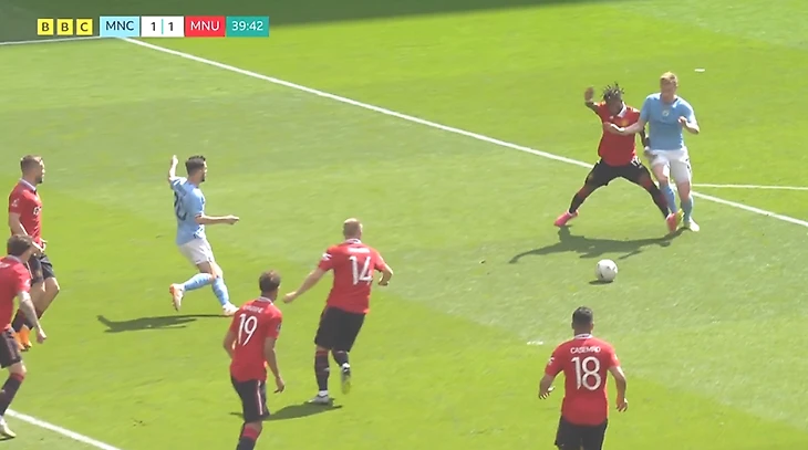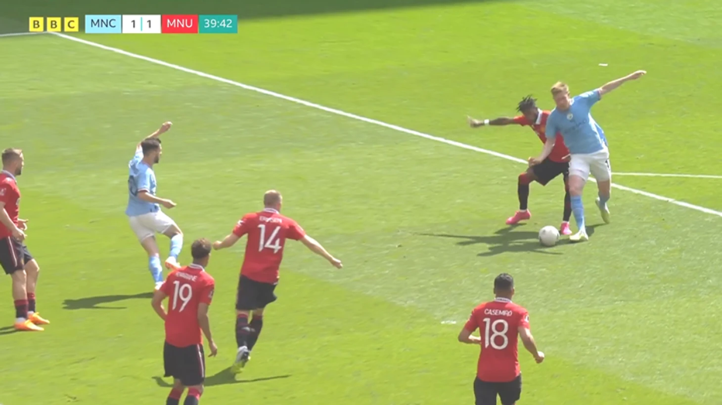 В финале Кубка Англии между «Юнайтед» и «Сити» уже случился самый быстрый гол в истории (13 секунда − привет, Гюндоган!) и судейский скандал. На 40-й минуте матча Джон Стоунз отдавал передачу Кевину Де Брюйне, который как раз вбежал в штрафную. После контакта с Фредом бельгиец оказался на газоне.