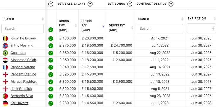 Самая большая зарплата в Англии у хавбека «Сити» Кевина Де Брюйне − 400 тысяч фунтов в неделю или 20,8 млн в год. На втором месте его партнер по клубу − Эрлинг Холанд (375 тысяч и 19,5 млн). Третье место у Каземиро из «Юнайтед» − 350 тысяч и 18,2 млн.