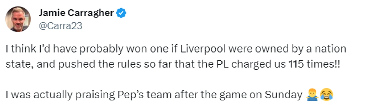 «Думаю, что я бы, наверное, выиграл, если бы «Ливерпуль» принадлежал целому государству и нарушил бы правила, после которых мне бы предъявили 115 нарушений. Я вообще-то хвалил команду Пепа после воскресной игры 🤷♂️😂»