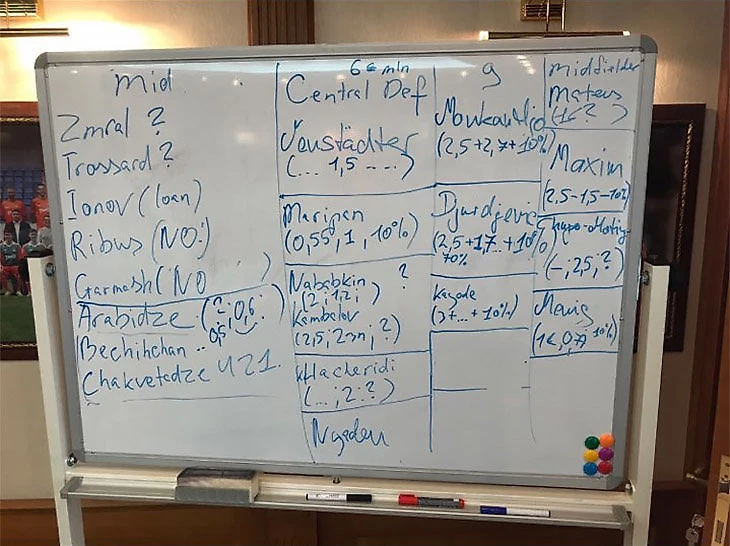 «Это трансферный шорт-лист моим почерком в переговорке «Локомотива», – объясняет Гоберман. – План был такой: Панченко и Штоффельсхаус называют футболистов, мы их обсуждаем. Если человек предлагает кого-то, а трое говорят «нет», то мы пишем «no» и даже не предлагаем футболиста Семину».