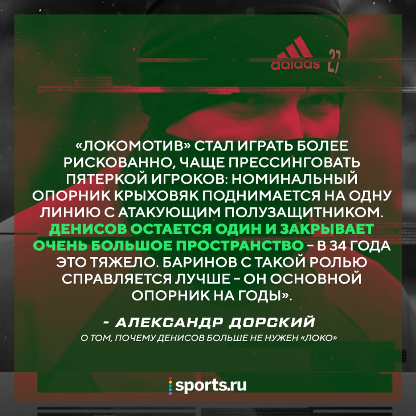 Баринов с такой ролью справляется лучше: очень агрессивный, может отдать длинный пас, пробить из-за штрафной. Скорее всего, это основной опорник команды на годы. Денисов «Локо» сейчас однозначно не нужен.