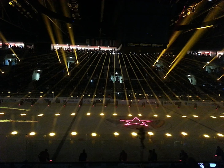 Игра же начинается медленно, с большим количеством довольно бессмысленных передач поперек площадки, и уже на второй минуте зрители начинают свистеть. Хоккеисты активизируются, вскоре счет становится 3:0 в пользу Запада. Вживую гораздо лучше, чем по телевизору, видно, насколько Матч всех звезд похож на фигурное катание. Несомненно, все происходящее очень красиво: элегантные перепасовки и головокружительные финты в миллиметрах от ворот завораживают. Но без каких-либо намеков на силовую игру хоккей кажется не очень настоящим.
