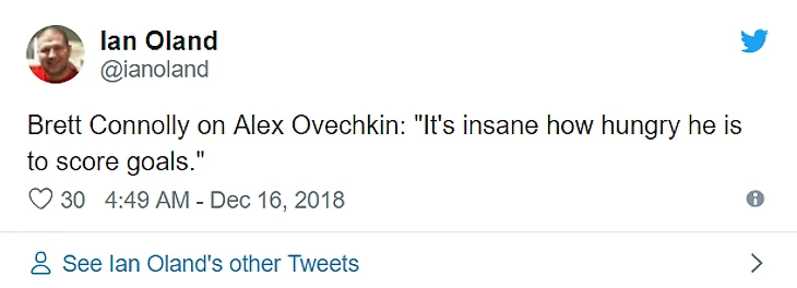 Во время первого перерыва насчет Овечкина вопрос задали Бретту Коннолли. Он выпалил, что «то, насколько он голоден до голов – безумие».