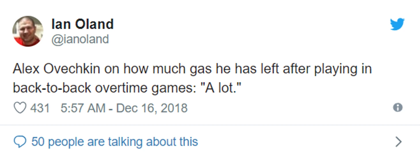 По окончании встречи интервью у Овечкина брал Ал Кокен. И Кокен спровоцировал легкий ответ на свой вопрос. «Кэпиталз» доводили дело до овертаймов в двух матчах кряду. Так сколько еще сил осталось у Овечкина?