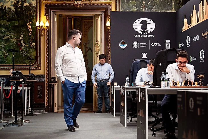 • Обе партии с Каруаной (он ближе всех в турнирной таблице) закончились миром, но складывались сложно для Непомнящего. В первой встрече американец задавал тон с самого начала и агрессивно атаковал, но Ян выбрался из сложного дебюта и дефицита в две пешки.