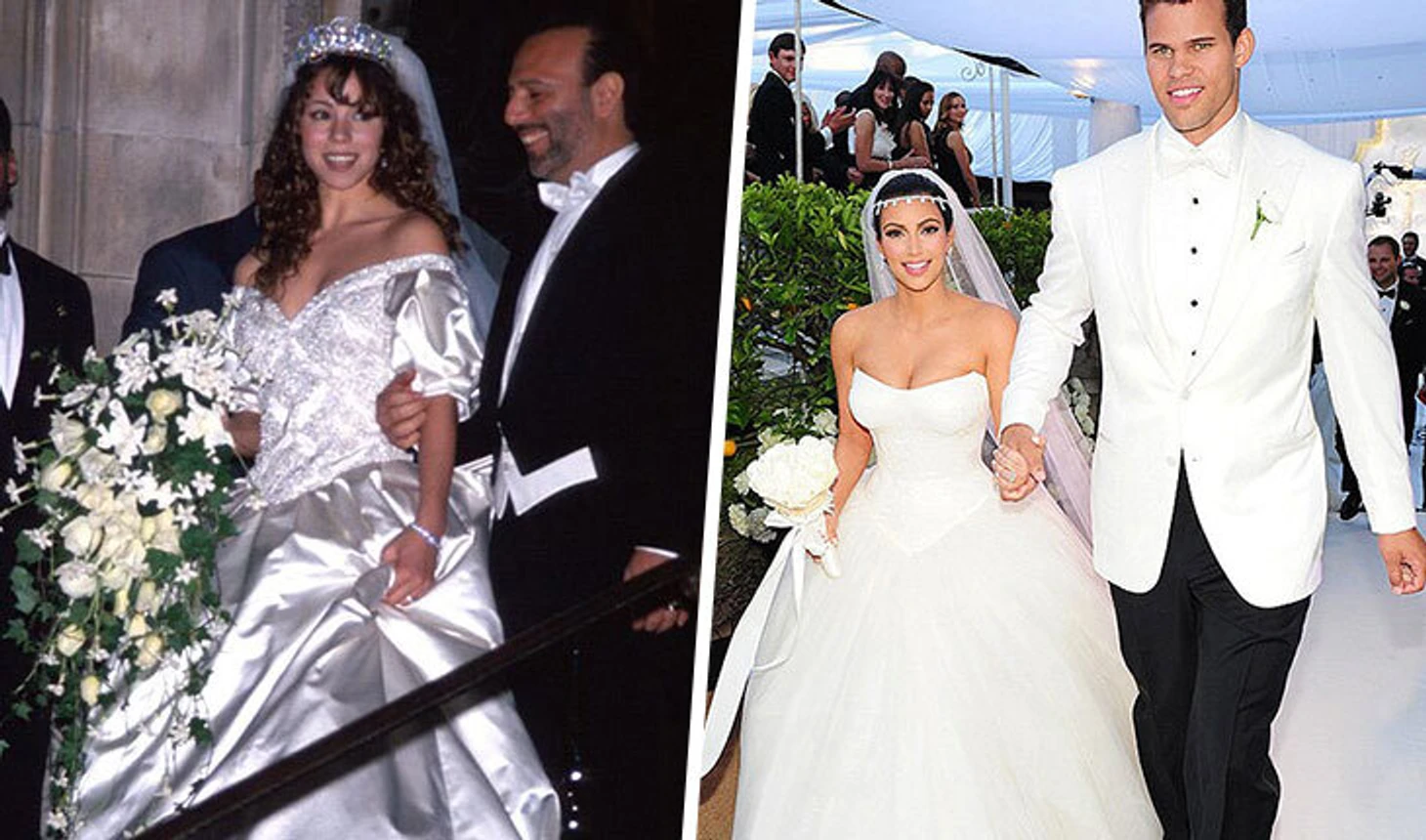 Мэрайя Кэри в 1993-м тоже выходила замуж в платье от Вонг. Наряд получился сказочным: вырез в форме сердца, камни, 8-метровый шлейф в сочетании с тиарой на голове сделали из певицы принцессу.