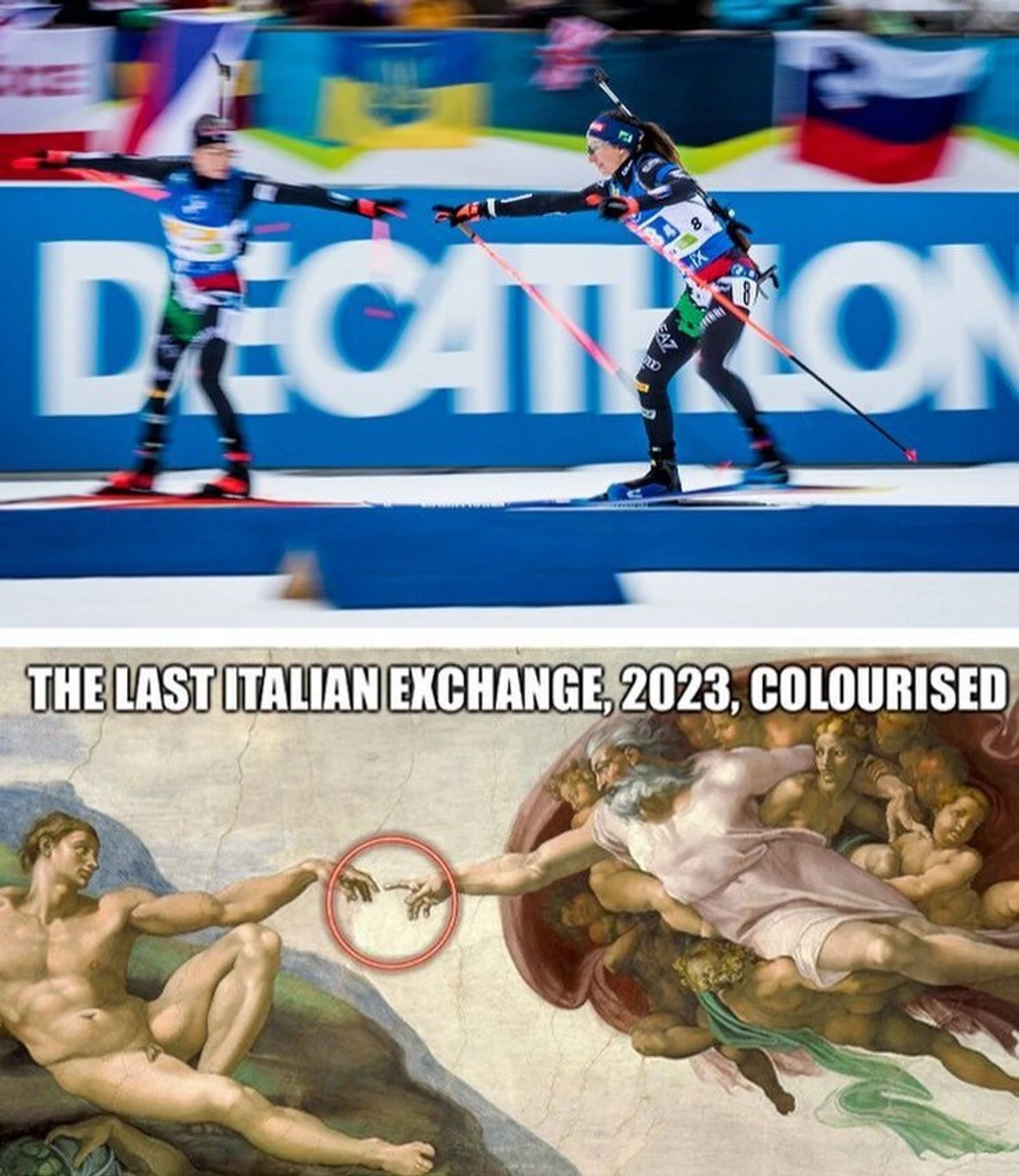 В этом сезоне обе выглядят отлично: борются за топ-3 в общем зачете, одержали по победе, а Лиза даже примерила желтую майку. И главное – кажется, помирились. А их передача в смешанной эстафете Поклюки уже превратилась в мем. IBU выложил коллаж-сравнение фото и фрески Микеланджело «Сотворение Адама».