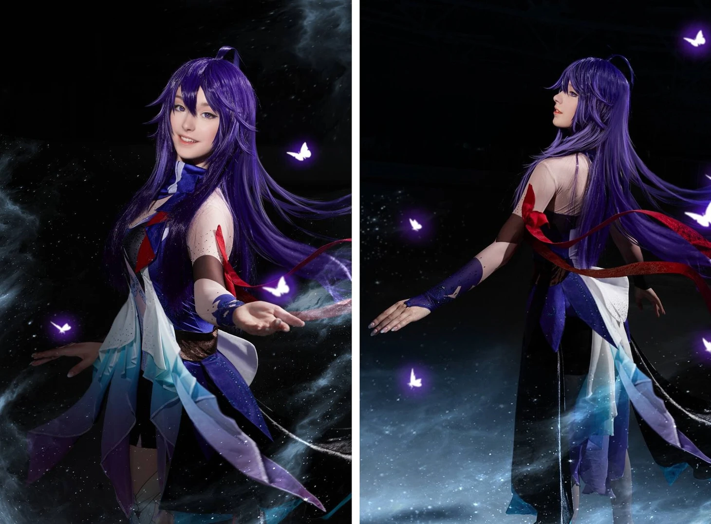 Появилась в образе Валькирии Зеле: фиолетовые волосы, разноцветное платье с шортами.