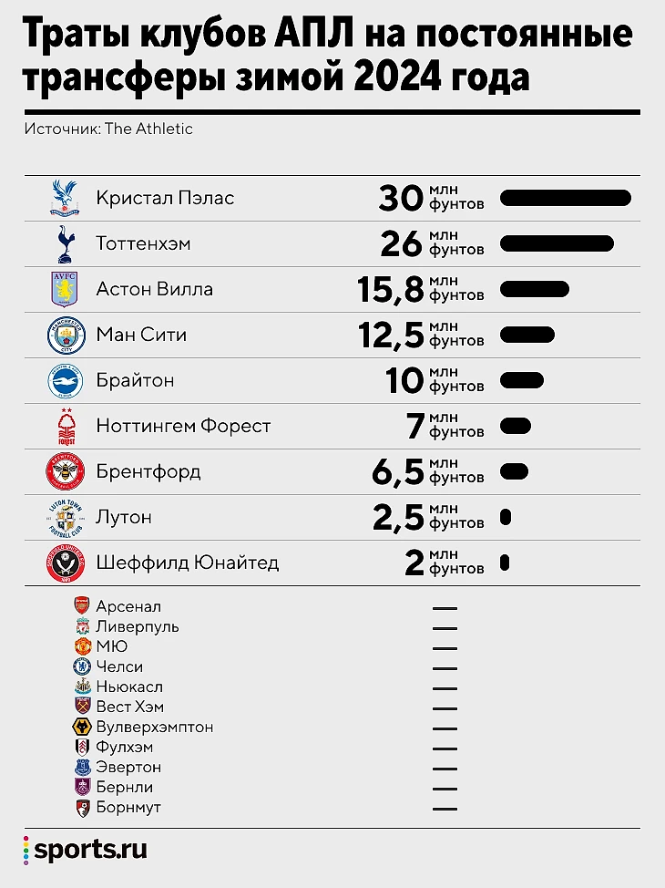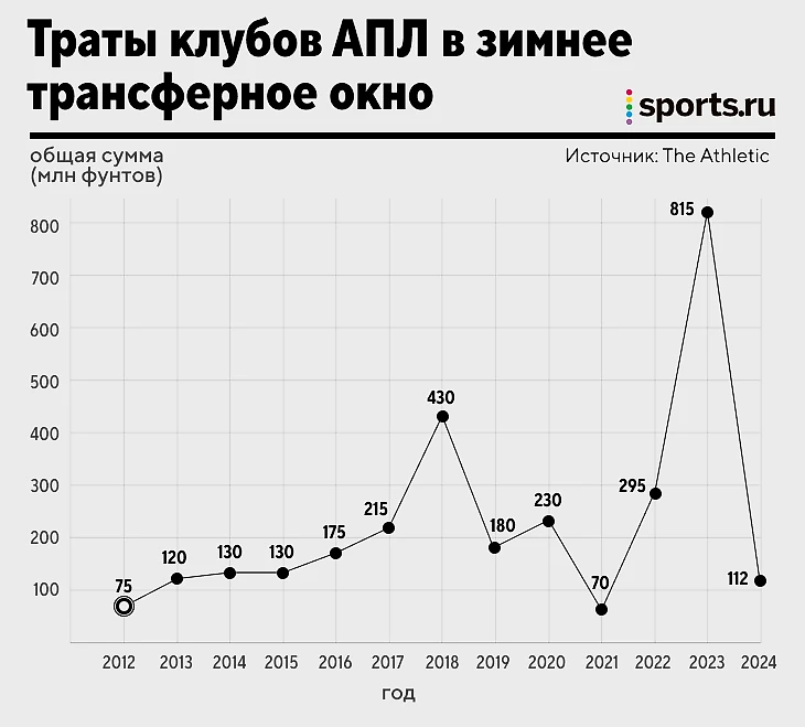 Клубы АПЛ потратили в это зимнее трансферное окно в восемь раз меньше, чем год назад – 112 млн фунтов против 815 млн. Для сравнения: зимой 2023-го «Челси» оставил на рынке в три раза больше, чем сейчас клубы, вместе взятые.