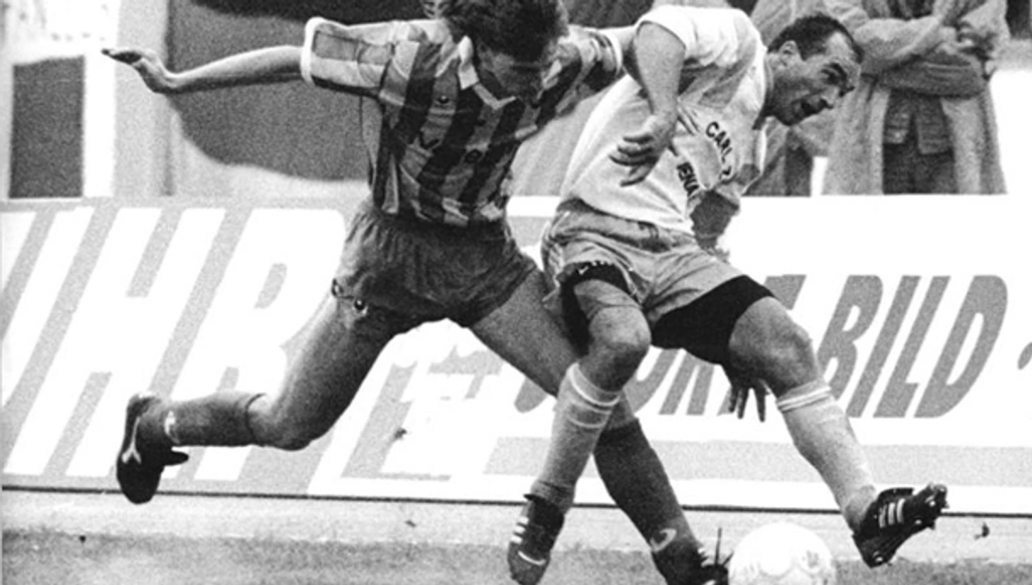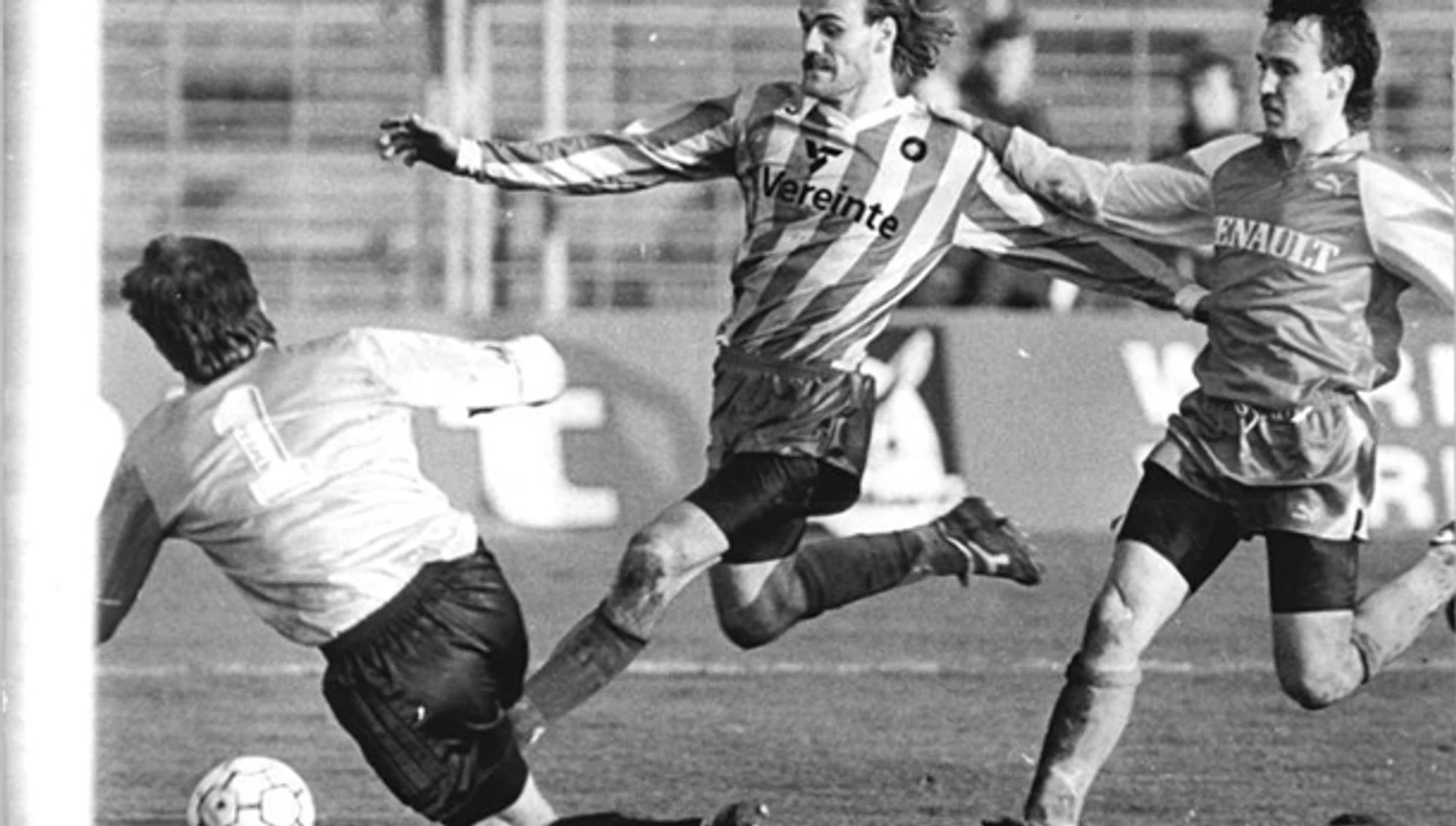 Начало октября 1990 года ознаменовалось выездом в Йену. Другой финалист Кубка обладателей кубков от ГДР не отметился гостеприимностью, огрев запасного вратаря «Локомотива» Майка Кишко тремя голами подряд. «Сине-желтые» ответили лишь голом все того же Маттиаса Линднера с пенальти под занавес встречи. На фотографии читатель видит борьбу югославского форварда «Карл Цайсс» Муневера Крайишника с защитником Франком Эдмондом — еще одним участником финального еврокубкового матча с «Аяксом». Свою карьеру Эдмонд продолжил в уже переименованном «Локомотиве» и только в 1999 году решил поехать доигрывать в «Айнтрахт» из Брауншвайга, который барахтался в низах немецкого футбола.