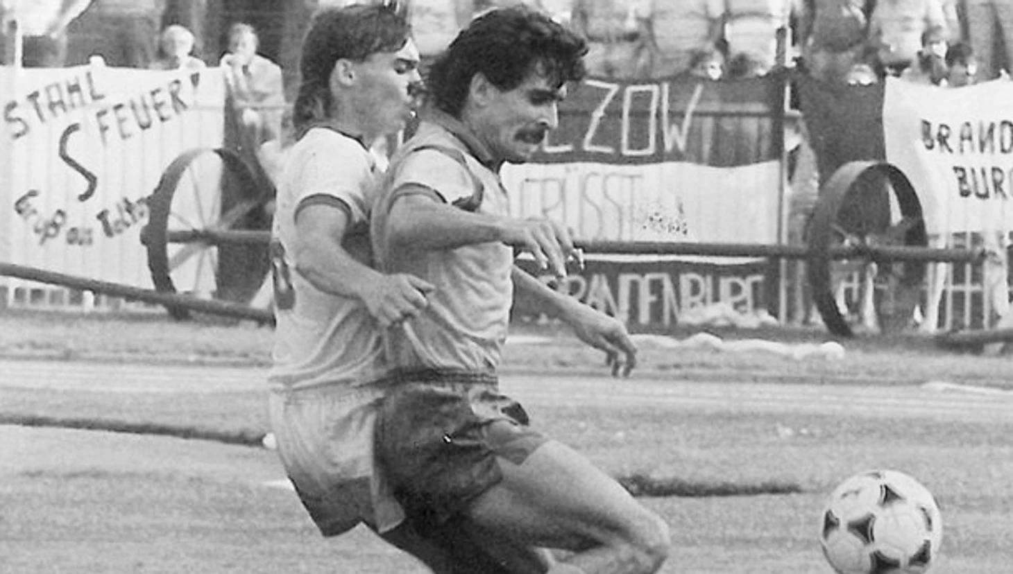 Третий тур. Нулевая домашняя ничья с командой «Шталь» из Айзенхюттенштадта. Сумели прочитать? Вообще, этот город основан в 1950 году, и буквально его название переводится, как «город металлургических заводов» — с фантазией порядок. Также одно время населенный пункт назвался Шталинштадт и считался «первым социалистическим городом в ГДР». Вернемся к футболу. На фотографии в полосатой футболке запечатлен Штефан Хаммермюллер — основной защитник «Локомотива», который тоже вскоре перешел в стан лейпцигского «Заксена», что вряд ли одобрили фанаты «сине-желтых».