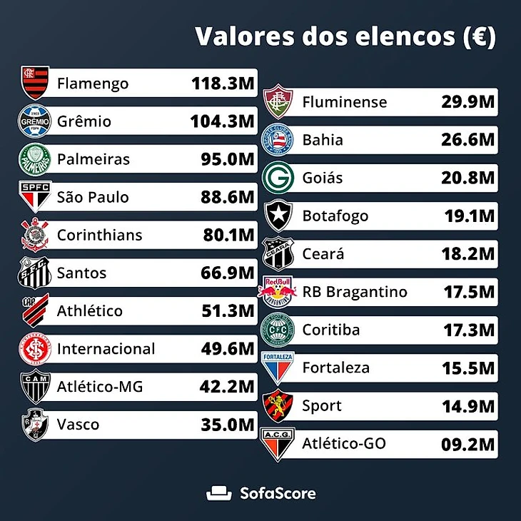 С другой стороны,когда любому бразильскому клубу дают за восемнадцатилетнего мальчишку 30 млн долларов,то президент лично на руках привезет покупателю этого игрока,перевязанного бантиком. Долги, увы,у многих очень большие,поэтому стараются продавать при первой возможности. Не до стратегии. Для сравнения самые дефицитные клубы Бразилии. Долги приведены в миллионах реалов, делите на 5 и получите в долларах