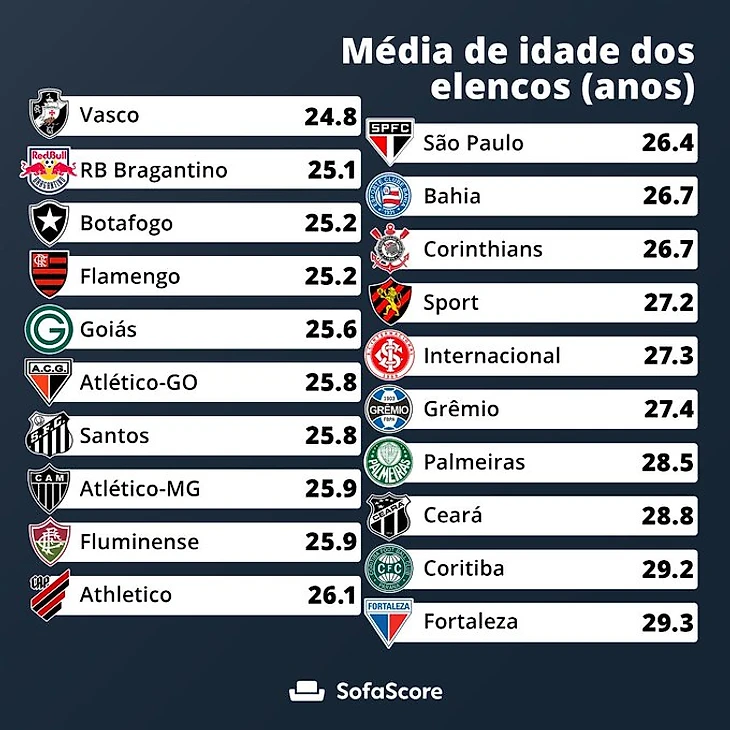 Кстати, по поводу упреков, что в Менгао одни старики. Средний возраст команд в этом году. Уберите заслуженных Рафинью,Филипе Луиса и обоих Диего и получите самую молодую команду Бразилии с отрывом.