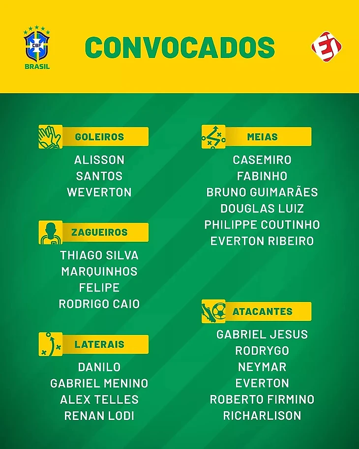 Впервые после чемпионата мира не вызван Артур. Причина-отсутствие игровой практики. Аж удивительно, раньше это не мешало некоторым персоналиям получать свой вызов. В отношении остальных вопросов ноль-тут либо давно заслуженно либо текущая форма и уровень позволяет полноценно рассчитывать на них в желтой футболке. Снова мимо Жерсон. Но из Менго и так двоих вызвали-кстати не удивлюсь что руководство рубро-негро еще повозмущается,ведь игроки пропустят 3 матча Бразилейрао. Плюс Тите видимо после победной Копы решил окончательно перевернуть треугольник в центре поля острием к атаке, а в этом построении для Коутиньо и Эвертона Рибейро больше шансов. А Джокеру надо заново находить себя,правда на мой взгляд и сам Торрент ни фига не знает,чего же он сам хочет от Жерсона-воланте/второй воланте/диспетчер-теоретически у него крутейший дуэт уровня обоймы сборной Тиаго Майя-Жерсон, практически 0-5 в Эквадоре и 0-3 с Гояненсе причем по игре.
