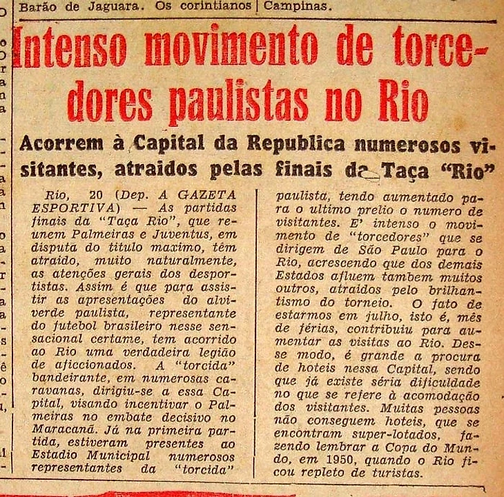 В первом противостоянии все решил единственный гол Родригеса на 21-й минуте. Теперь "Палмейрасу" было достаточно ничьей во втором финале. Согласно отчету Diário Popular of Rio de Janeiro, одной из главных газет Рио, блестящий футбол, показанный Альвиверде заслуживал более внушительного перевеса в счете, однако газетчики не могли не отметить солидную итальянскую оборону, которая смогла без особых проблем сдержать бразильскую атаку.