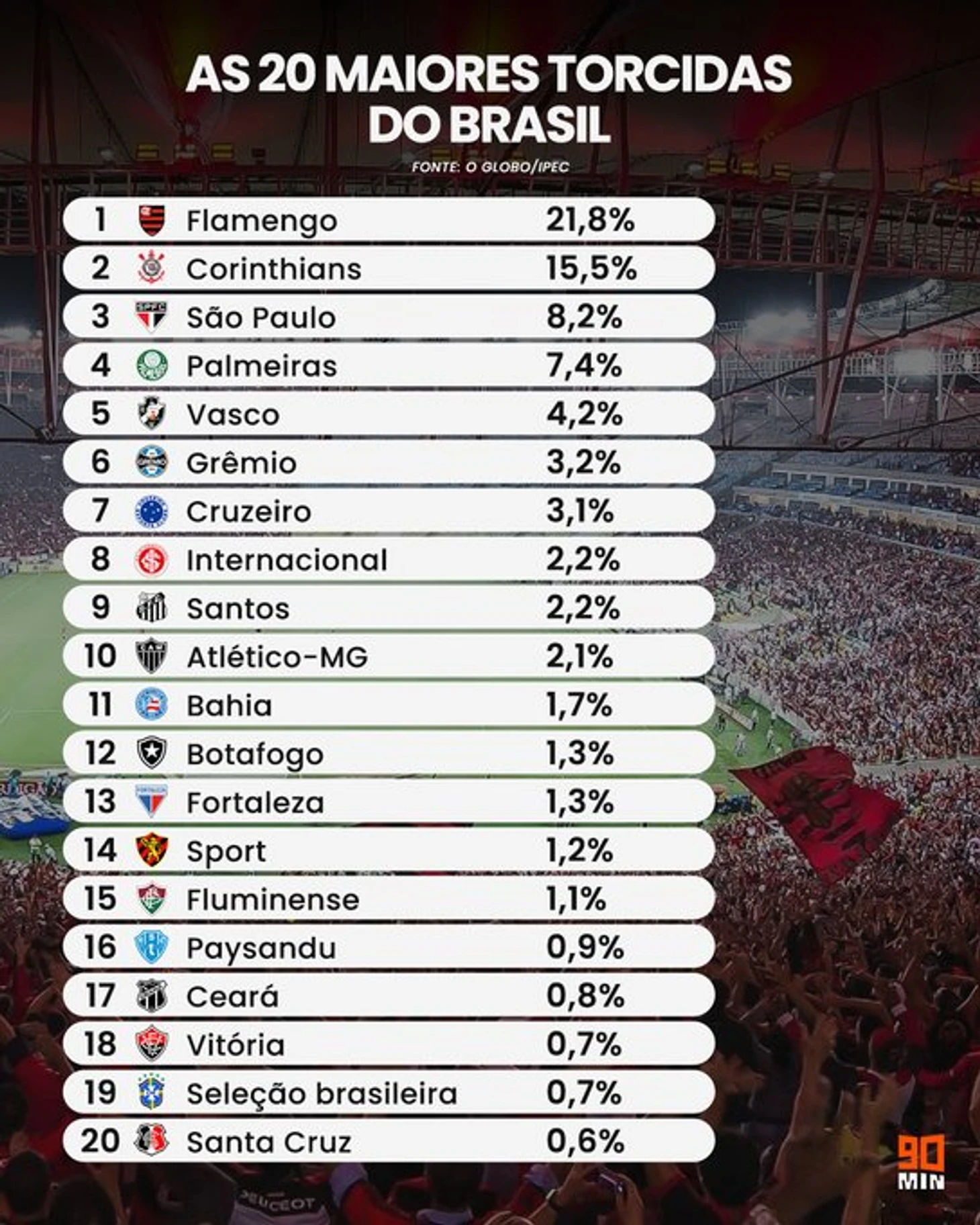 Да и негоже этим клубам, за которые суммарно болеют 10% торсиды в Бразилии прозябать на задворках. Обратите внимание сколько человек по итогам исследования Глобо болеет за сборную, печаль...