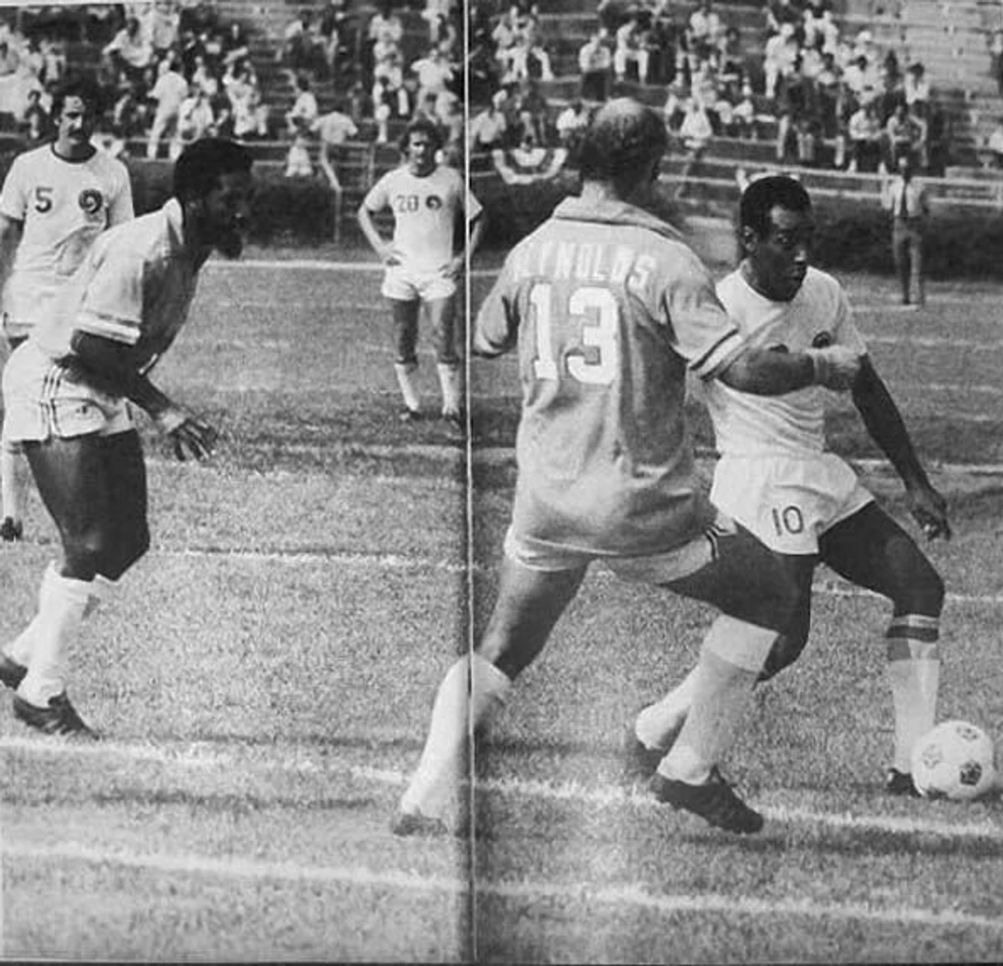 Пеле понадобилось больше часа игрового времени, чтобы чуть привыкнуть к ужасному полю и к необычному мячу (те, которыми играли тогда в NASL, были легче и мягче, чем классические, и силу ударов пришлось соизмерять с этим). А главное, чтобы вписаться в игру команды подмастерьев со скромными способностями. Хитроумные передачи короля футбола то и дело уходили в пустоту – новые партнеры бразильца просто не понимали его замыслов. В результате, "Космос" еще до перерыва пропустил два сухих мяча от Элти Маккензи и Дэвида Чедвика, и счет 0:2 держался до середины второго тайма. Но к заключительной четверти матча Пеле, игравший оттянутого нападающего, наконец, наладил взаимодействие с центрфорвардом нью-йоркцев Мордехаем Шпиглером. Это и неудивительно, поскольку израильтянин был весьма неплохим игроком: до "Космоса" он исправно забивал за "ПСЖ", а на ЧМ-1970 стал автором единственного гола своей национальной сборной на турнире. А потому справедливо считался главной звездой команды до появления бразильского кудесника. Именно удачные действия связки Пеле – Шпиглер и спасли для хозяев этот матч. Сначала бразилец передачей вразрез организовал израильтянину выход один на один, и тот хитро прокинул мяч мимо голкипера "Далласа" Кенни Купера. А спустя 9 минут Пеле установил окончательный счет в матче: откликнулся на заброс Шпиглера с правого фланга и, перепрыгнув четверых (!) защитников соперника, головой вколотил мяч в сетку. Стадион взревел от восторга, а фотографы, дежурившие за воротами техасцев, выбежали на поле, чтобы сделать более крупные снимки короля футбола, радующегося своему успеху. Телезрители же увидели исторический гол лишь в повторе, поскольку Пеле забил в тот самый момент, когда режиссер трансляции решил показать повтор одного из предыдущих эпизодов с его участием. Такая вот ирония судьбы. В своем послематчевом блиц-интервью у кромки поля Пеле сказал журналистам: "Нам нужно провести еще несколько игр вместе, лучше узнать друг друга, прежде чем мы действительно сможем начать играть. Но, судя по сегодняшнему выступлению, я не сомневаюсь, что мы можем стать очень хорошей командой".