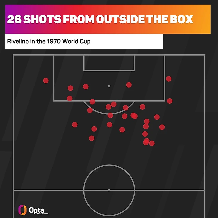 Любопытный рекорд принадлежит Ривелино-он нанес 26 ударов из-за пределов штрафной площади на чемпионате мира 1970 года, это больше, чем у любого игрока того чемпионата. Бразилец попал в створ в 46% попыток.
