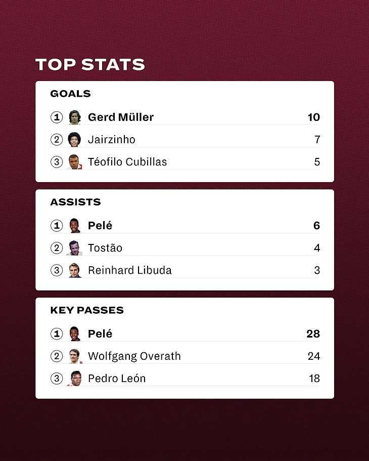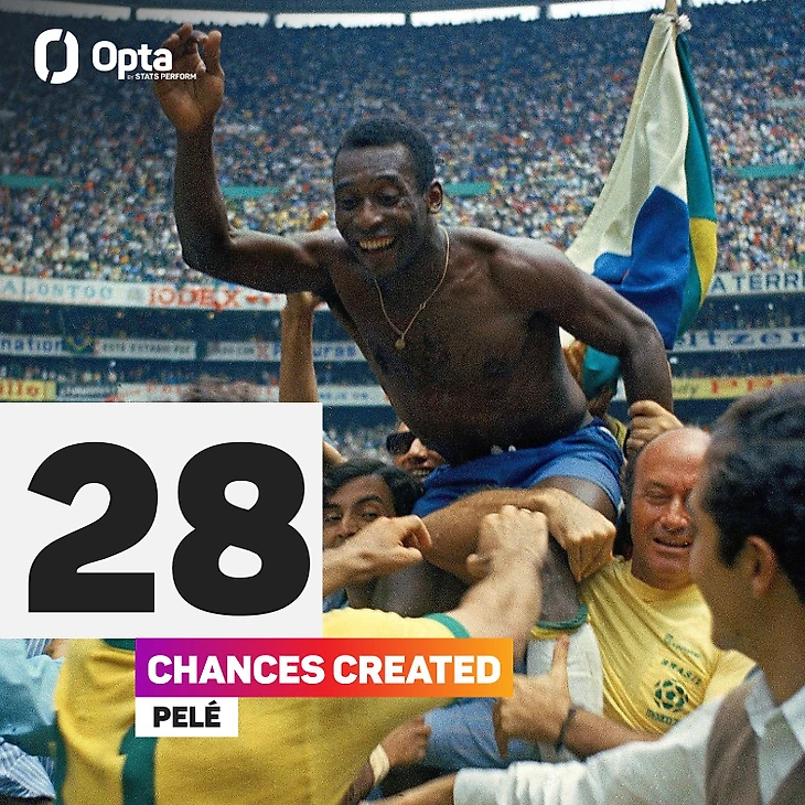 Пеле создал 28 моментов на чемпионате мира по футболу 1970 года, больше всех и на том Мундиале и в истории. Шесть из этих моментов завершились голами.