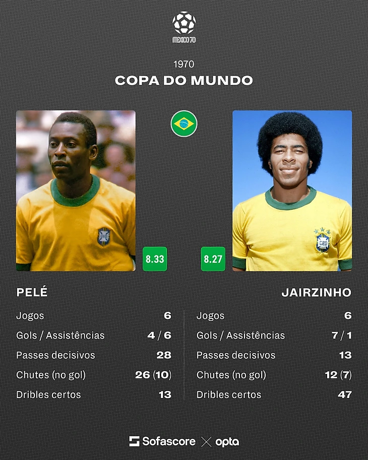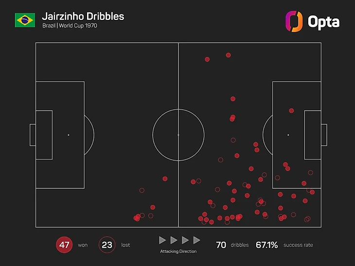 Жаирзиньо сделал 47 обводок на чемпионате мира 1970 года, что более чем в два раза больше, чем у любого другого игрока на том чемпионате.