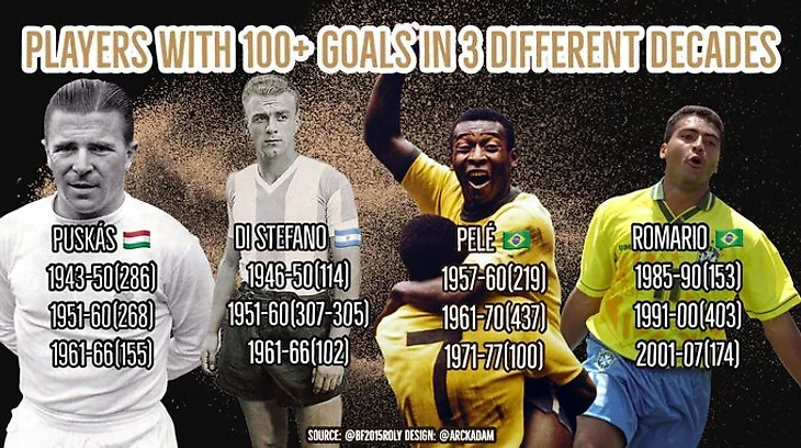 P.s. Можно как угодно относиться к Ромарио, сравнивая его с Роналдо или другими великими бразильцами. Но факт есть факт. В истории футбола существовало лишь два игрока, забивших 150+ голов в трех десятилетиях. Это Пушкаш и Байшиньо. Или четыре со 100+.