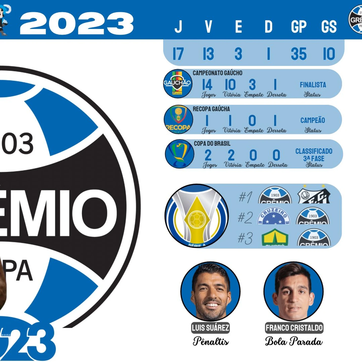 "Гремио" вернулся. Ренато Гаушо тоже, так что на пресс-конференциях скучно не будет. Впрочем как и на поле. В межсезонье Ренато решил удивить всех и полностью перестроить полузащиту. Отчасти из-за травмы Феррейриньи, но кто ж влезет в голову Порталуппи и узнает истинную причину? Были куплены 26-летние уругваец Карбальо и аргентинский плеймейкер Кристальдо, из «Сеары» забран Вина, а из «Куябы» Пепе. И команда заиграла в модуле с де-факто пятью центральными полузащитниками. Вот только уже с другими ролями-открытие прошлого сезона и начала этого Бителло (воланте/второй воланте в прошлом году) стал по сути правым вингером, Вина левым, но опять же все это условно. Смена позиций, импровизация, хороший со скидкой на количество новичков прессинг и атаки на скорости пока меня по хорошему удивляют.
