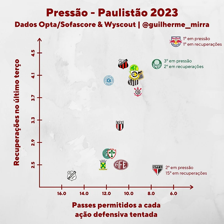 Но конечно по заветам Рангника «Брагантино» Педро Кайшиньи делает ставку на интенсивный прессинг, имея лучший PPDA в Паулисте.