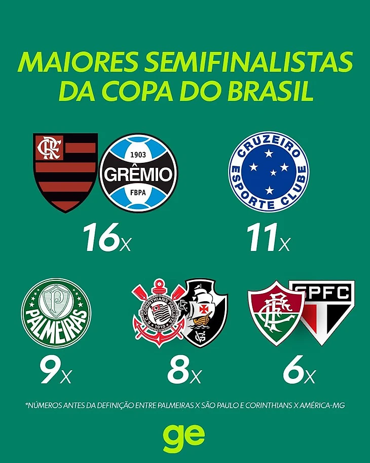 Кстати Гремио и Фламенго чаще других в истории выходили в полуфинал Кубка Бразилии.