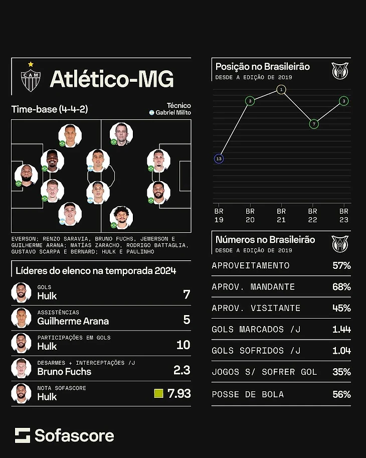 Обладающий одной из сильных и сыгранных команд страны, «Атлетико Минейро», начинает Бразилейрао-2024 в новом облике. После восстановления чемпионских амбиций и стабильной игры с Луисом Фелипе Сколари в прошлом году руководство Гало все же уволило многоопытного тренера в марте. Игра команды, на самом деле, в начале года оставляла желать лучшего, и Габриэль Милито – неплохой кандидат на то, чтобы добиться желаемого футбола от звездного состава Гало.
