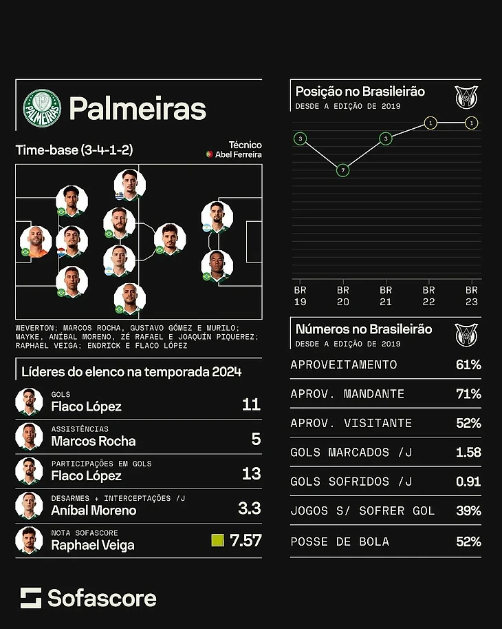 Последний чемпионат страны – лучший пример того, как время, проведенное португальцем Абелом Феррейрой в клубе (а это аж 4 года, неслыханная роскошь для бразильских тренеров), позволило команде не запаниковать, когда «Ботафого» казалось бы улетел в стратосферу, чемпионской гонки, а быстрее и точнее адаптироваться к условиям, более смело вносить изменения в тактическую схему, пробовать разных игроков, в том числе и в новых ролях.