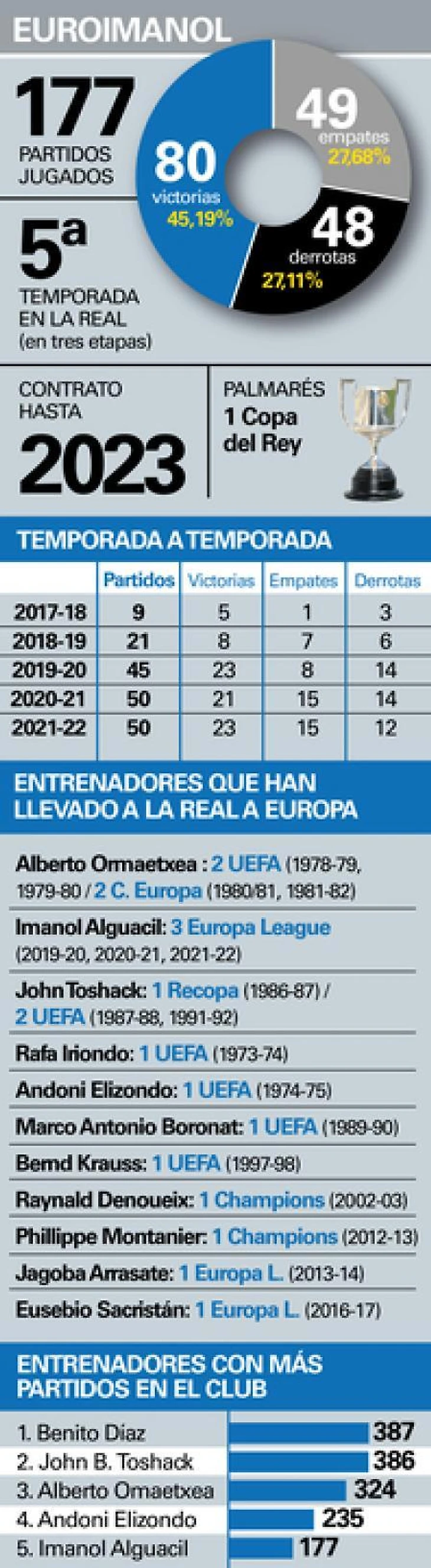 «Реал Состедад» пол руководством Иманола вышел в Лигу Европы в 2020 году с 56 очками. Год назад «Реал Сосьедад» набрал 62 очка. Если Иманоль не проиграет в следующее воскресенье «Атлетико», то побьет свой рекорд по набранным очкам, на данный момент у команды 62 очка.