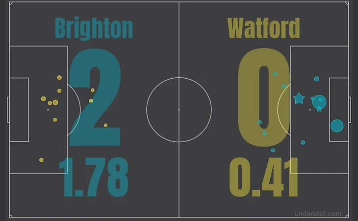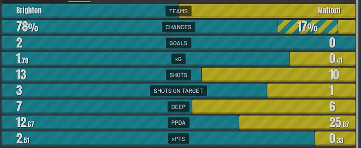 "Брайтон" нанёс больше ударов (в том числе и в створ), прессинговал практически в два раза лучше (показатель PPDA) и превзошёл "Уотфорд" по владению (56% на 44%).