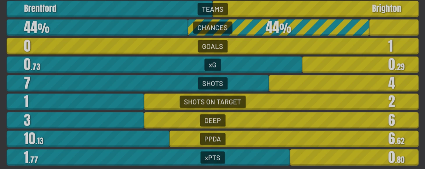 "Брайтон" нанёс больше ударов в створ, но меньше ударов в сумме. Однако "Брайтон" прессинговал почти в два раза лучше показатель (PPDA). Что касается владения, то и здесь "Брайтон" превзошёл соперника (команда Поттера владела мячом 58%, а Франка 42% соотвественно).