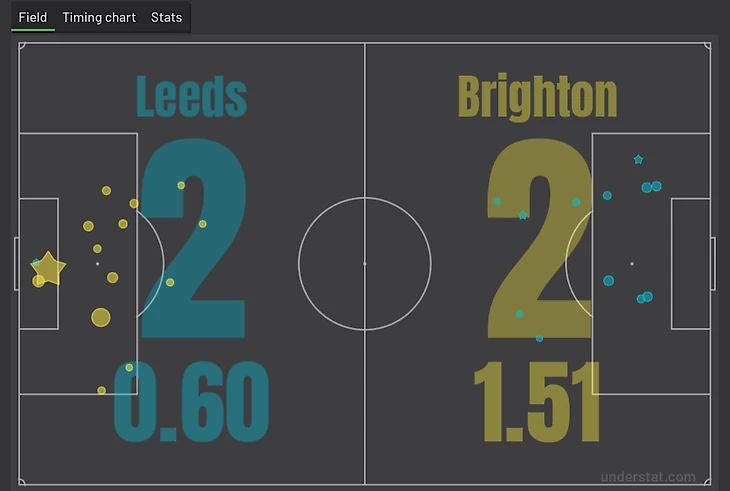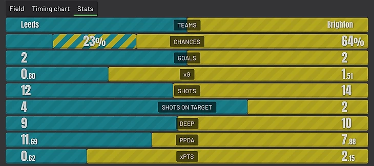 Несмотря на то, что «Брайтон» явно доминировал (62% владения, больше ударов, отборов, передач и так далее), «Лидс» приятно удивил меня высоким прессингом, классными атаками. Одна из немногих команд, которая не сидела против нас в обороне 90 минут.