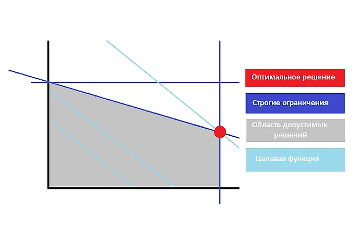 Когда наконец все требования озвучены, в игру вступает математика. Если бы задача состояла в нахождении двух искомых переменных, то её можно было бы изобразить графически на плоскости следующим образом. Строгие ограничения (синие линии) представляются в виде прямых, которые ограничивают допустимую область решений (серая область), а целевая функция (голубая линия), которая задаётся суммой нарушаемых мягких ограничений, подбирается таким образом, чтобы эта сумма была минимальна. Как только алгоритм находит пересечение данной области и целевой функции при минимальности последней – задача решена.