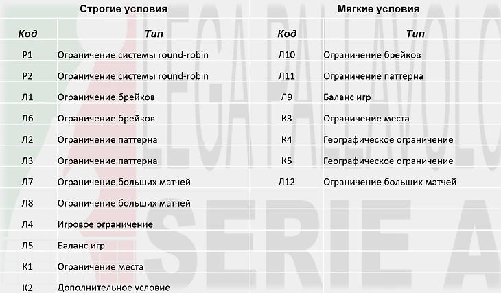 Итальянская волейбольная лига накладывает много негибких требований на календарь. К примеру, ограничения системы double round robin как раз относятся к строгим условиям. Помимо них существуют условия, моделируемые как мягкие. Ниже представлены все ограничения модели, классифицированные по их происхождению.