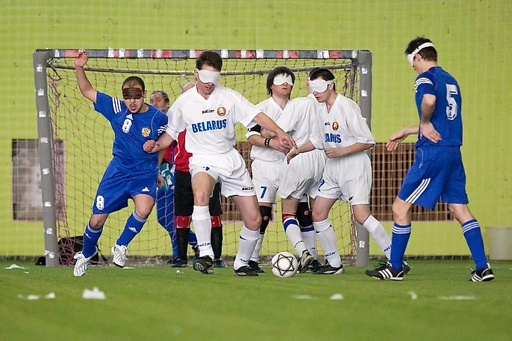 Футбол для незрячих — разновидность большого футбола, в который играют люди, не имеющие зрения. Первый чемпионат мира среди незрячих прошёл в 1986 году в Испании. В 2004 году футбол для незрячих включен в программу Паралимпийских игр-2004. Все участники игры, кроме тренера и вратаря, лишены права говорить, чтобы игроки слышали указания вратаря и звуки, которые издаёт мяч. На глазах у игроков непросвечивающие очки, чтобы те, кто различает свет, были на равных с теми, кто живёт в постоянной тьме.