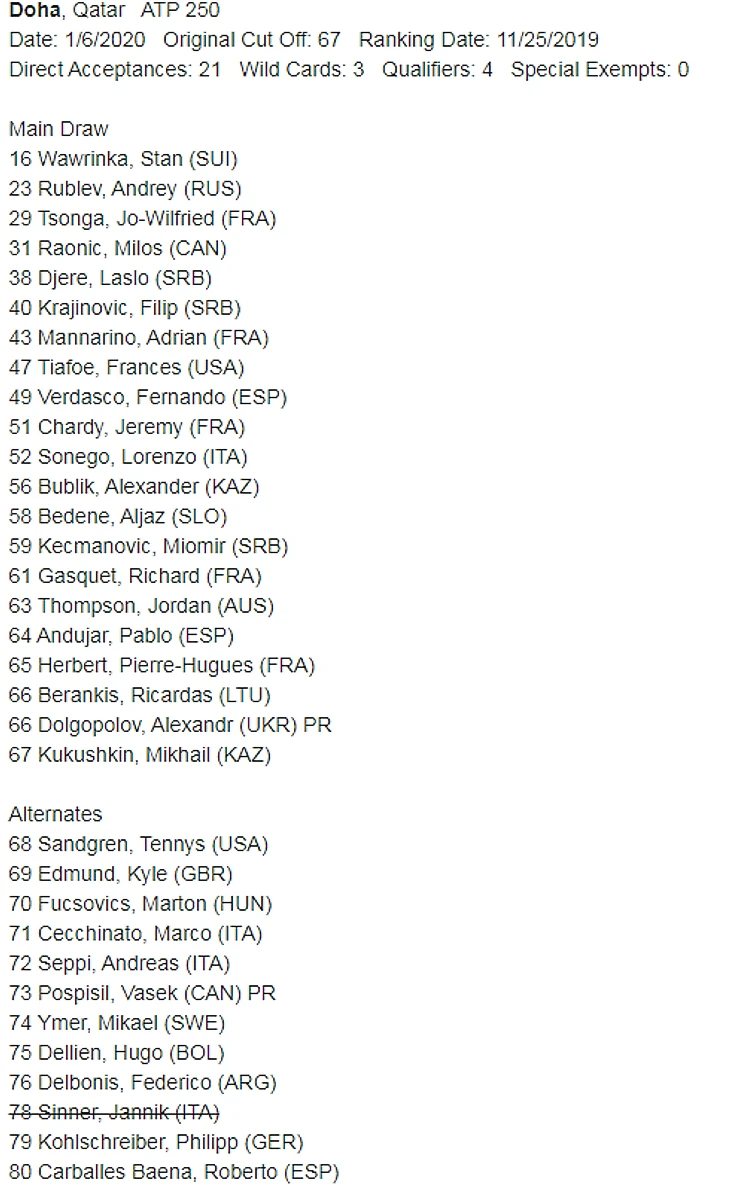 Я постепенно подбираюсь к главной теме — к ATP Сup. Именно из-за этого новообразования, бессмысленного и беспощадного аки российский футбол, потеряны мужской Брисбен и Кубок Хопмана. На февраль переехала Пуна, а на первой неделе АТР осталась только Доха. Исторически качественный турнир, но и он тоже оказался заложником АТР Cup. Иллюстрация этому проста — заявочный лист на Доху.