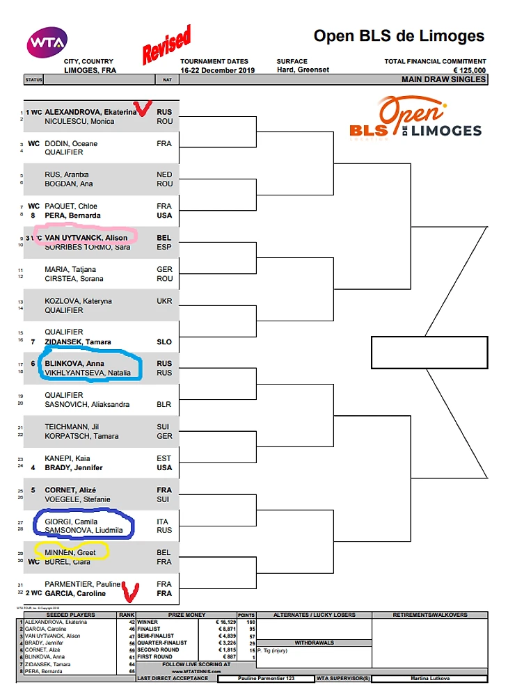 Короткая ремарка. Новый сезон вроде уже того-этого, но старый-то еще не закончился. С понедельника в Лиможе женщины сыграют 125-тысячник. Для глубокого декабря состав лиможский очень неплох!