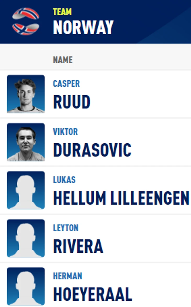 В группе D три сборные без вопросов. У нас Медведев с Хачановым плюс Кравчук для пары. У итальянцев - Берреттини, Фоньини, Травалья, Лоренци, Болелли. У американцев - Иснер, Фритц, Опелька и на пару Рам с Крайчеком. Что тут делает Норвегия? ХЗ...