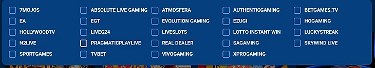 В разделе Live-Казино более скромный выбор азартных развлечений. Игрокам доступны тайтлы от 24 провайдеров. На сайте казино игры от таких разработчиков как: