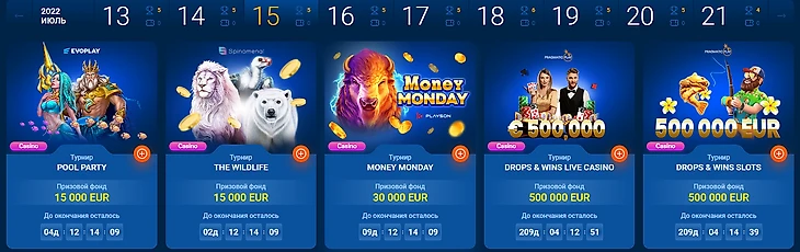 В разделе «Турниры» представлены акции с большим призовым фондом. В зависимости от длительности соревнований формируется призовой фонд. На момент выхода обзора «Мостбет» предлагал пять турниров с призовым фондом от 15 до 500 000 евро.